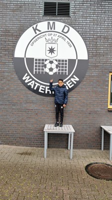 Vandaag sprak ik samen met ons Hoofd jeugd Opleidingen, Jeremy van der Stap oud KMD-er Marouan el Messoaudi. Op 4-jarige leeftijd werd hij lid bij KMD en speelde van de mini F tot de JO9-1 bij KMD. Marouan woont in Wateringen en kwam bij KMD bij zijn vader die ook lid van de club is geweest. Marouan is altijd bezig met voetballen en een echte liefhebber. Hij weet goed wat hij wil en dat is later full prof worden. Het liefst bij Ajax want dat is zijn favoriete Nederlandse club. Toen hij op 6 jarige leeftijd al door Feyenoord werd gescout weigerde hij aanvankelijk bij een testwedstrijd in Rotterdam om het shirt aan te doen. Hij dacht dat hij dan nooit meer met goed fatsoen bij Ajax terecht zou komen. Spelen bij Feyenoord ging niet door. Marouan speelt nu bij ADO Den Haag, maar KMD is hij nooit vergeten. Marouan begint aan zijn verhaal “op KMD was het altijd leuk en gezellig en mijn vriendje Nick speelt er nog. Onder trainer Raymond van Dullemen heb ik veel geleerd. Bij ADO is het professioneler en heb ik meer trainingen en uitdagingen.” Marouan is met zijn 9 jaar best wel wijs en kan goed vertellen over zijn POP (persoonlijk ontwikkel plan) bij ADO en de punten waar hij aan moet werken. ”Het is je eigen verantwoordelijkheid om jezelf elke keer weer te verbeteren”. Wat is je favoriete speler en club vraag ik hem? “Lewandowski en Bayern München”, ook een mooie club die op de aanval speelt. Geniet eerst maar lekker bij ADO en wordt daar de beste en als het niet lukt, Marouan, ben je altijd welkom op KMD. Voordat hij weer naar huis gaat, maakt hij nog een praatje met KMD1-aanvoerder Jesse de Waard, die afspreekt desnoods nog 9 jaar door te voetballen om met Marouan in KMD1 samen te spelen. Maar eerst gaat Marouan nog geroutineerd op de foto. Die komt er wel! Goed ventje met de juiste houding. Succes en zet em op Marouan bij ADO, we zijn bij KMD erg trots op je.