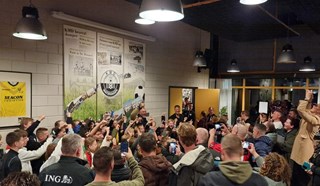Oud Feyenoord-speler en huidig assistent van trainer Arne Slot John de Wolf bracht afgelopen vrijdagavond samen met Jumbo Koornneef een bezoek aan KMD om het eerste voetbalplaatjesalbum uit te reiken aan ons jongste lid Finn Vrolijk. In een volle kantine met meer dan honderd jeugdspelers nam John de Wolf ruimschoots de tijd om handtekeningen uit te delen en met alle aanwezige jeugdleden op de foto te gaan. De sympathieke oud Oranje International is nog steeds populair bij de meegekomen moeders. Ook hier nam hij de tijd om op de foto te gaan.