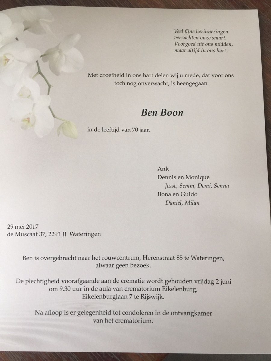 U bent vrijdag 2 juni as. van harte uitgenodigd om Ben de laatste eer te bewijzen. De kaart die aan de vereniging is verstuurd, vindt u elders op de site.