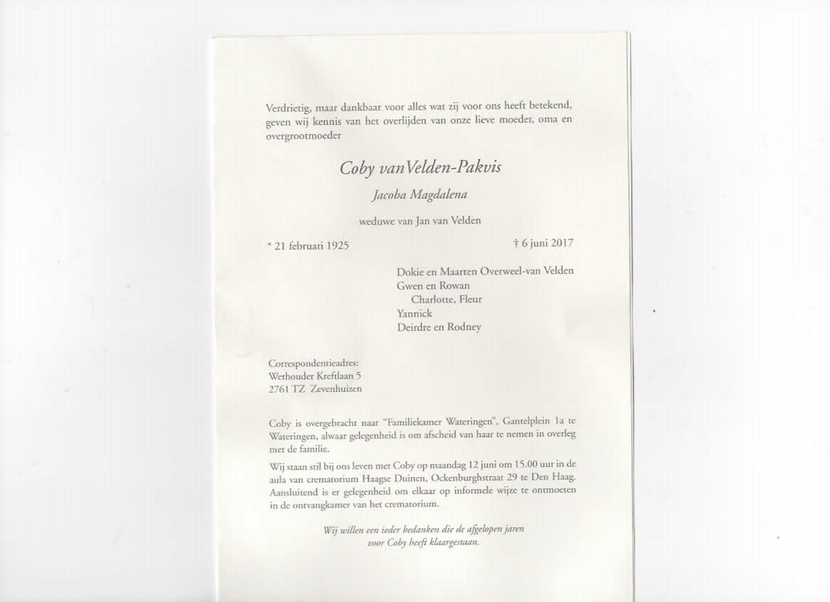 Na het overlijden van “ome Jan” heb ik haar nog enkele malen bezocht samen met Martin van der Schoor, die haar regelmatig bleef bezoeken. Met het overlijden van Coby van Velden, verliezen wij iemand van een unieke generatie, die hebben meegewerkt aan de opbouw van onze vereniging.