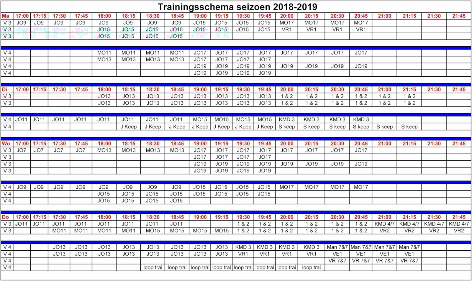 Bijgevoegd het trainingsschema voor het seizoen 20180-2019.
