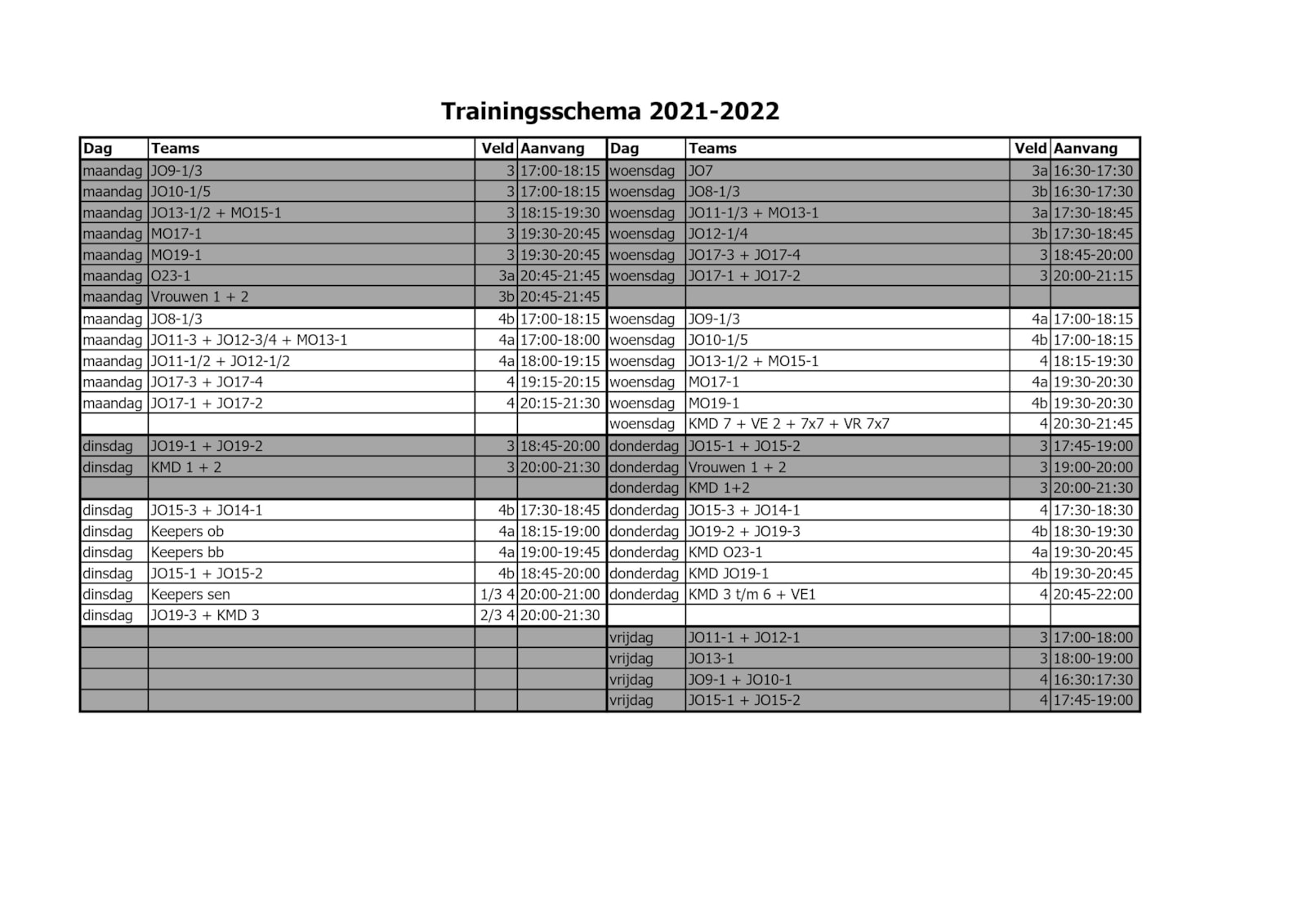 Hierbij het nieuwe trainingsschema voor het seizoen 2021-2022.
