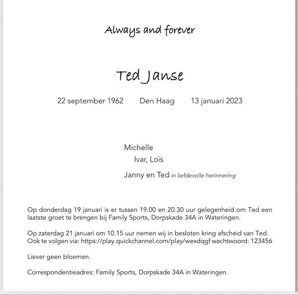 Ted stond altijd open voor een clinic voor onze jeugd en geblesseerde spelers konden bij Family Sports in een gemoedelijke sfeer werken aan hun herstel.  De verslagenheid op de vereniging is groot en in Ted verliezen wij een sympathieke en sportieve kracht.