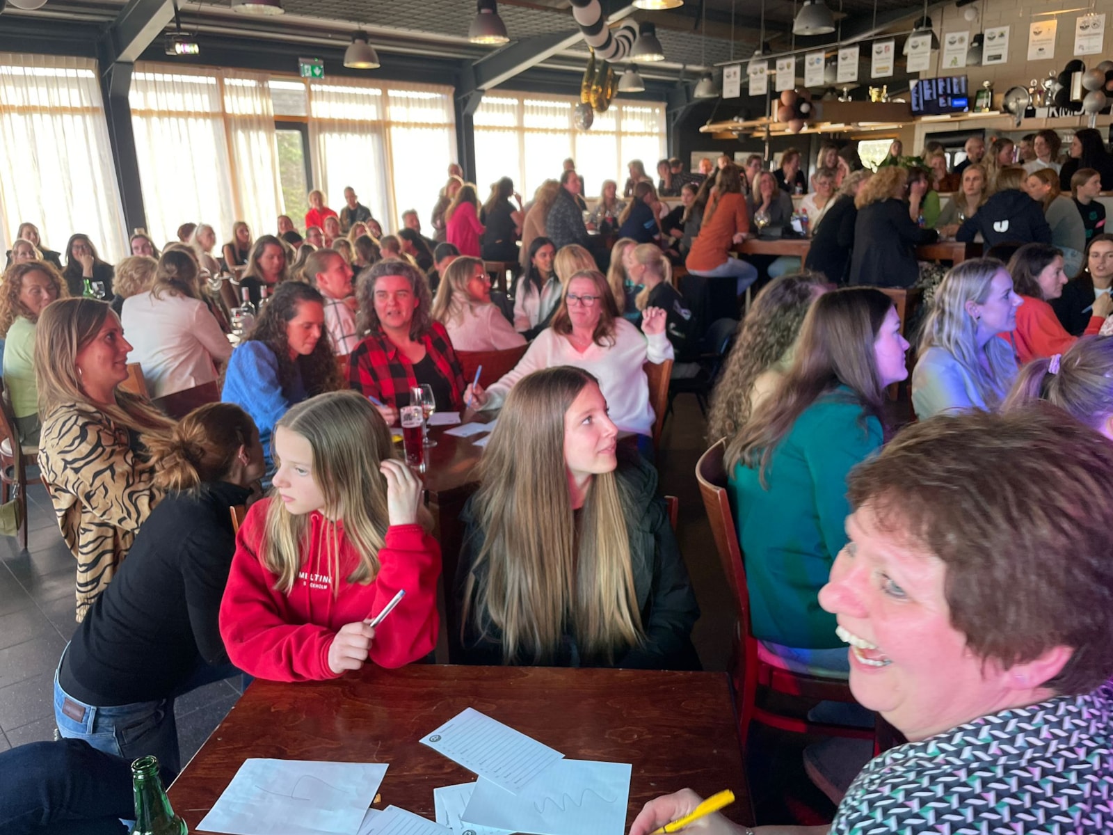 Onder leiding van Inge startte niet veel later de pub quiz. De teams ware gemaakt en ik mocht in een team aantreden met o.a Fleur, Sien, Chantal, Elina, Marlous en Laura. Een mooie verdeling waarbij Chantal, Marloes en ik ons mochten bekommeren wie op de foto’s van voor 1990 stonden in de eerste ronde en de rest wist feilloos alle nummers te raden uit ronde twee. Ondanks dat we met een goed gevoel de quiz hadden afgerond vielen we net naast de prijzen. Zeker Sien had graag die kaartjes voor het Nederlands damesteam gewonnen.