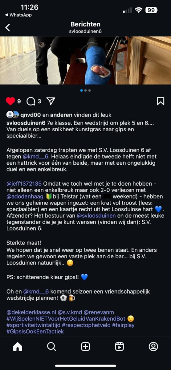 De spelers en begeleiding van Loosduinen hebben daarop afgelopen week contact met KMD 6 gezocht en er zijn woensdagavond op KMD 2 spelers van Loosduinen langsgekomen om Jeffrey een hart onder de riem te steken middels een kratje speciaal bier en een hartverwarmende kaart.