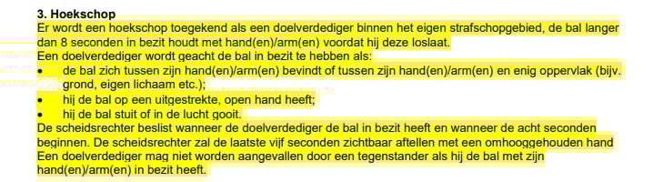 Houdt een keeper de bal langer dan acht seconden vast met de handen of armen binnen het strafschopgebied, dan wordt een hoekschop toegekend aan de tegenpartij.